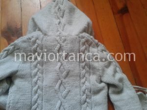 Arka için 80 ilmek atınız. Lastik için 3 cm bir ters bir düz lastik örünüz. Lastik bitip düz örgüye geçtiğinizde iki yanlara 3’lü saç örgü ve ortaya kabartma baklava örgüsü koyun. 25 cm ördükten sonra kolaltı oyuğu için her iki yandan 4+3+1 kesip 18 cm örünüz iki omuz için 21+21 ilmek bırakıp ortada kalan ilmeği tek seferde kesin. Omuzları 7+7+7 olarak gidip gelerek üç seferde kesiniz.